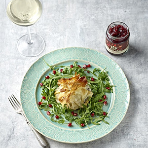 Preheat your oven to 180°C, gas mark 6. On a baking sheet layer 3 sheets of filo pastry brushing a little oil between each layer. Slice the Camembert in half and place in the centre of the filo pastry. Top with our cracking cranberry sauce then bring the sides of the filo pastry up to cover the Camembert. Do the same with the other half of the Camembert, then place them in the oven to bake for 20 minutes or until the pastry is golden.